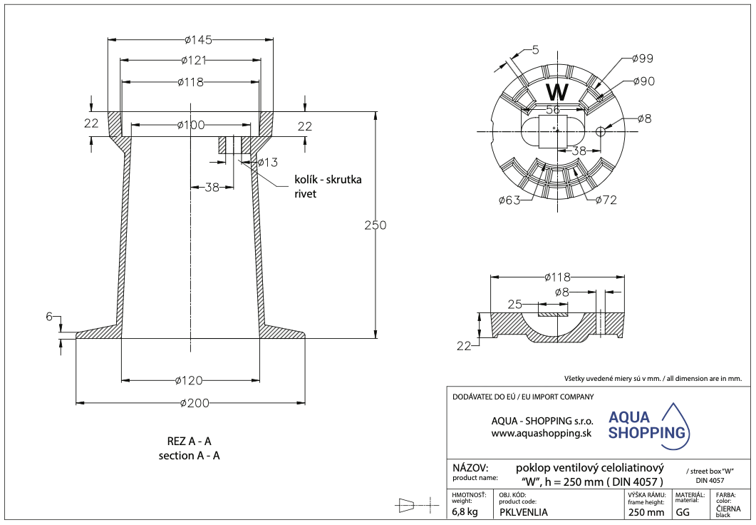 Celoliatinový ventilový (prípojkový) poklop VODA je určený na zakrytie a ochranu uzatváracích ventilov domových vodovodných prípojok. Najčastejšie sa osádza pri rodinných domoch, menších objektoch a na hranici pozemku, kde je potrebné mať bezpečný a rýchlo dostupný uzáver vody. Masívne liatinové prevedenie so stabilným rámom zaručuje pevné uloženie v teréne a dlhú životnosť. Nápis „W“ na kryte umožňuje jednoznačnú identifikáciu média a odlíšenie od plynových prvkov. Poklop chráni ventil pred zasypaním, nečistotami a mechanickým poškodením, pričom uľahčuje obsluhu pri údržbe, revízii alebo havarijnom uzavretí prívodu vody.